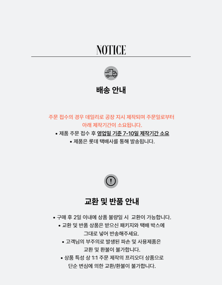 - 1:1 주문 제작되는 상품은 주말/공휴일을 제외하고 7~15일정도 소요됩니다. (성수기 시즌 상품에 따라 3주 소요)